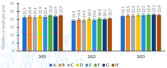 Number of seeds per pod. A—nitrogen (150 kg ha−1)–control, B—nitrogen (200 kg ha−1), C—nitrogen + sulphur (150 kg ha−1 + 20 kg ha−1), D—nitrogen + sulphur (200 kg ha−1 + 20 kg ha−1), E—nitrogen + sulphur (150 kg ha−1 + 40 kg ha−1), F—nitrogen + sulphur (200 kg ha−1 + 40 kg ha−1), G—nitrogen + sulphur (150 kg ha−1 + 60 kg ha−1), H—nitrogen + sulphur (200 kg ha−1 + 60 kg ha−1).