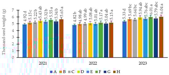 Thousand-seed weight (g). A—nitrogen (150 kg ha−1)–control, B—nitrogen (200 kg ha−1), C—nitrogen + sulphur (150 kg ha−1 + 20 kg ha−1), D—nitrogen + sulphur (200 kg ha−1 + 20 kg ha−1), E—nitrogen + sulphur (150 kg ha−1 + 40 kg ha−1), F—nitrogen + sulphur (200 kg ha−1 + 40 kg ha−1), G—nitrogen + sulphur (150 kg ha−1 + 60 kg ha−1), H—nitrogen + sulphur (200 kg ha−1 + 60 kg ha−1).
