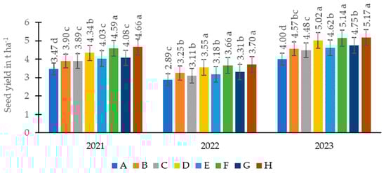 Seed yield in t ha−1. A—nitrogen (150 kg ha−1)–control, B—nitrogen (200 kg ha−1), C—nitrogen + sulphur (150 kg ha−1 + 20 kg ha−1), D—nitrogen + sulphur (200 kg ha−1 + 20 kg ha−1), E—nitrogen + sulphur (150 kg ha−1 + 40 kg ha−1), F—nitrogen + sulphur (200 kg ha−1 + 40 kg ha−1), G—nitrogen + sulphur (150 kg ha−1 + 60 kg ha−1), H—nitrogen + sulphur (200 kg ha−1 + 60 kg ha−1).
