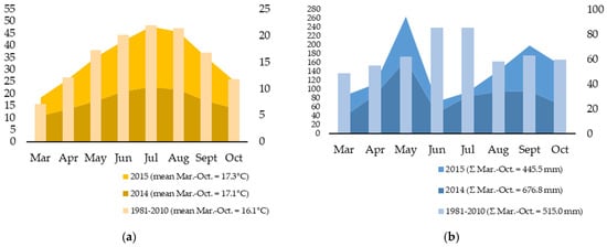 The weather data are presented in Figure 1. In 2014, the mean air temperature in the vegetation was similar to the long-term mean (LTM), but the total rainfall was 24% higher (Figure 1a). In May 2014, extremely high rainfall was experienced, with a 170% increase compared to the LTM (61.7 mm). In contrast, 2015 saw a 14% decrease in rainfall from March to October compared to the LTM (Figure 1b). Air temperatures in July (24.9 °C) and August (24.0 °C) of 2015 were approximately 3 °C higher than the LTM. In addition to the high temperatures, there was a significant lack of rainfall in 2015, particularly in July, when the total monthly rainfall was only 9.5 mm, a decrease of 88.8% compared to the LTM of 85.1 mm.