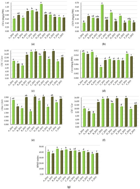 Dynamics of the leaf pigment status of sugar beet leaf in vegetative growth (A—30 May; B—20 June; C—10 July; D—30 July; E—20 August; F—10 September), (a) Chl a (mg/g FW), (b) Chl b (mg/g FW), (c) Chl a + b (mg/g FW), (d) Caro (mg/g FW), (e) Chl a/Chl b, (f) Chl/Caro, (g) SPAD index. Means with the same letter are not significantly different from each other (p < 0.05 ANOVA followed by LSD test).