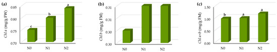 The Chl a + b content was on average 1.05 mg/g FW and it was significantly different in relation to N fertilization (Figure 3c). The highest N dose (N2) increased the Chl a + b content by 11% compared to the control treatment.