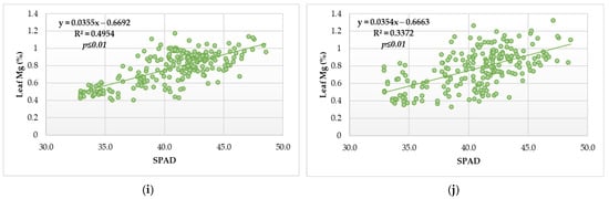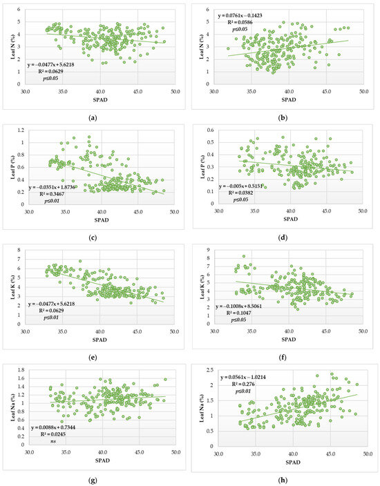 The regression analysis determined a significant relationship for all macroelements in the leaf and SPAD value (Figure 4a–f,h–j), except for the Na in 2014 (Figure 4g).
