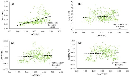 Relationship between macroelements in the sugar beet leaves and N content (%) in the leaves (n = 432) as: (a) leaf P (%) and N (%) content, (b) leaf K (%) and N (%) content, (c) leaf Na (%) and N (%) content and (d) leaf Mg (%) and N (%) content.