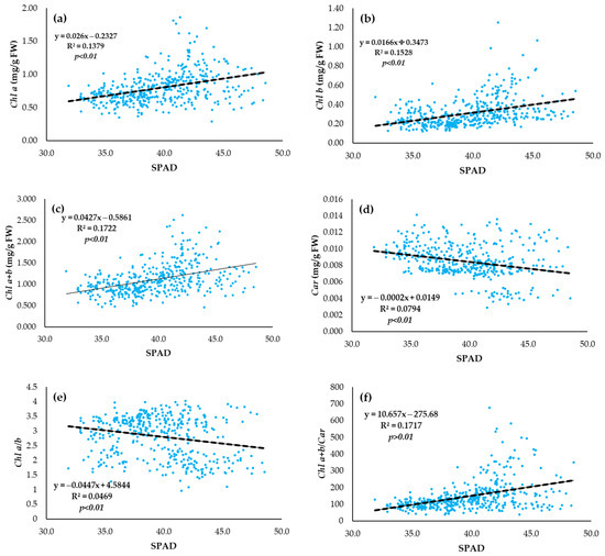 Relationship between leaf pigment status and SPAD index values of sugar beet for (n = 432): (a) Chl a (mg/g FW) and SPAD index, (b) Chl b (mg/g FW) and SPAD index, (c) Chl a + b (mg/g FW) and SPAD index, (d) Car (mg/g FW) and SPAD index, (e) Chl a/b and SPAD index and (f) Chl a + b/Car and SPAD index.