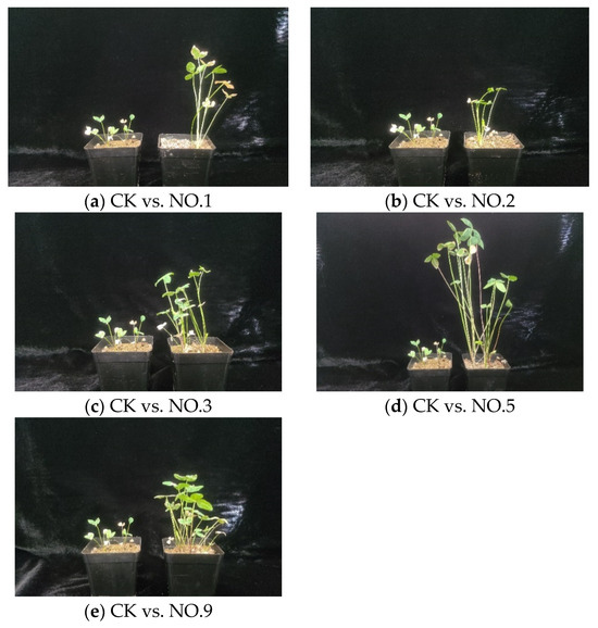 Inoculation with an R. gallicum strain induced growth of bacterial communities that have often been reported as PGPM (plant growth-promoting microorganisms) [24]. The extent of these changes was also seen in the next rotation crop. Therefore, rhizobial inoculation resulted in increased shoot growth, number of pods, and grain yield of faba bean [26] and lentil [27] compared with non-inoculated controls. In our study, the plant height of clover plants inoculated with rhizobia significantly increased compared with CK, with the best effect being the treatment inoculated with the No. 5 strain. This may be because a strict indoor control trial was conducted in this experiment and a nitrogen-deficient nutrient solution was chosen for the plants, resulting in different results. In addition, substances secreted into the rhizosphere by rhizobia, including acetoin, 2,3-butanediol, siderophores, auxins, and other phytohormones, have plant growth-promoting properties [28].