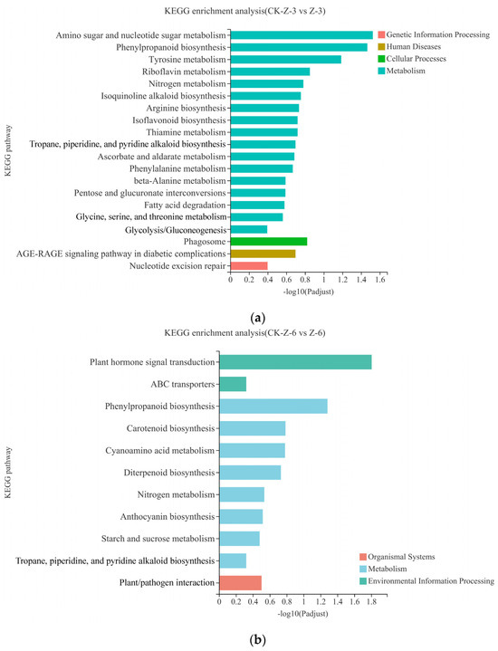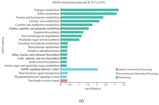 Annotation analysis of the KEGG pathway was performed on the differential genes of the three comparison combinations. DEGs of CK-Z-3 vs. Z-3 were significantly enriched in amino sugar and nucleotide sugar metabolism, Phenylpropanoid biosynthesis, and Tyrosine metabolism; DEGs of CK-Z-6 vs. Z-6 were significantly enriched in Phenylpropanoid biosynthesis and plant hormone signal transduction; DEGs of CK-Z-9 vs. Z-9 were significantly enriched in nitrogen metabolism, sulfur metabolism, taurine and hypotaurine metabolism, linoleic acid metabolism, cysteine and methionine metabolism, alanine, aspartate and glutamate metabolism, arginine biosynthesis, glycosaminoglycan degradation, and the MAPK signaling pathway—plant (Figure 2).
