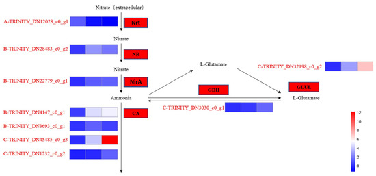 Note: A-gene serial number represents DEGs under CK-Z-3 vs. Z-3 treatment, B-gene serial number represents DEGs under CK-Z-6 vs. Z-6 treatment, C-gene serial number represents DEGs under CK-Z-9 vs. Z-9 treatment. Red indicates upregulated DEGs and blue indicates downregulated DEGs. Nrt: Nitrate/nitrite Transporter; NR: Nitrate Reductase; NirA: Ferredoxin-Nitrite Reductase; CA: Carbonic Anhydrase; GDH: Glutamate Dehydrogenase (NAD(P)+); GLUL: Glutamine Synthetase.
