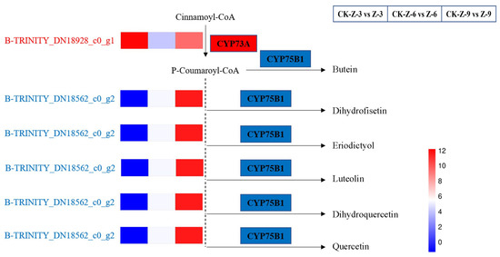 Note: B-gene serial numbers represent DEGs under CK-Z-6 vs. Z-6 treatment. CYP73A: trans-cinnamate 4-monooxygenase; CYP75B1: flavonoid 3′-monooxygenase.