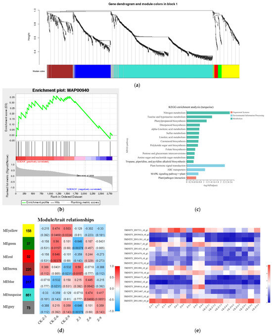 Weighted Gene Co-expression Network Analysis (WGCNA) between inoculated rhizobia treatment and control treatment: (a) hierarchical clustering showing 7 modules of co-expressed genes. Each leaf in the tree represents one gene; (b) correlation of modules with each treatment group and the corresponding p-values. The left panel shows the 7 modules and the number of genes in each module. The right panel shows a color scale for module/trait correlations from −1 to 1; (c) KEGG enrichment analysis of “turquoise” module; (d) GSEA analysis showing enrichment; (e) leading subset heat map.