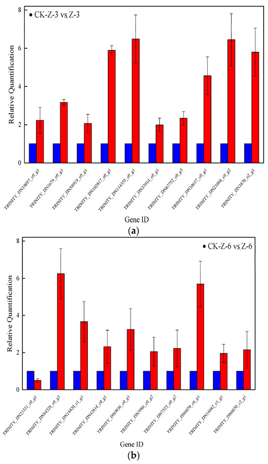 To validate the consistency of the RNA-seq data, ten differentially expressed genes associated with key metabolic pathways were randomly selected from each of the three comparison combinations and analyzed using quantitative Real-Time PCR (qRT-PCR). The results, presented in Figure 6, demonstrate a strong correlation between the qRT-PCR data and the RNA-seq expression profiles, confirming the accuracy of the transcriptome sequencing data.