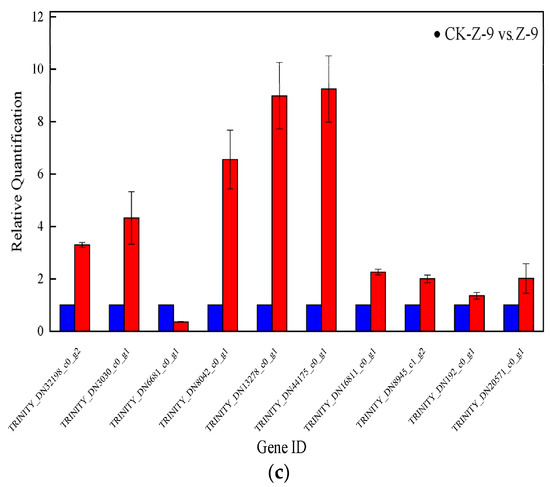 qRT-PCR verification of differentially expressed genes. (a) qRT-PCR results of the first comparison group; (b) qRT-PCR results of the second comparison group; (c) qRT-PCR results of the third comparison group.