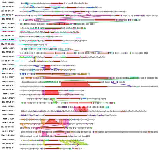 Several genomes contained large numbers of partial or fragmented BGCs on contig edges. For example, KDM-22-161-SBBG had 15 partial fragments distributed across small contigs, likely representing one–three distinct BGCs. The total number of gene clusters for KDM-22-161-SBBG was assumed to have one additional BGC from the fragments. Similarly, KDM-22-148-DFB, KDM-22-177-SBBG, and KDM-23-275-IPS contained three, three, and one partial fragment, respectively, potentially belonging to additional BGCs or overlapping clusters that were not counted towards the total number of BGCs.