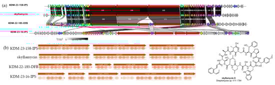 Three BGCs across Streptomyces isolates were identified as bearing sequence homology to the nonribosomal peptide natural products family skyllamycins. (a) The gene cluster alignment between the BGCs from NBB-associated strains and the skyllamycin BGC was completed using clinker. Red-coloured genes indicate NRPS, all other colours randomly assigned by clinker to indicate closely related genes [44]. (b) Module and domain predictions of all BGCs retrieved from antiSMASH and MIBiG.