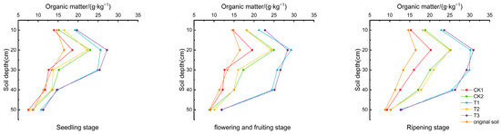 As depicted in Figure 2, the soil organic matter content at various depths increased throughout the tomato growth period, peaking in the 10–20 cm layer. Compared to CK1, increases in the 10–20 cm layer’s organic matter content were 38.037–49.849% and 45.405–52.904% for T1 and T3, respectively. CK2 and T2 also showed increases of 24.056–27.695% and 20.081–24.415%, respectively. These results demonstrate that the combined application of biochar and biogas slurry significantly enhances the soil organic matter content, with less pronounced effects observed from the sole application of biogas slurry (CK2). The addition of DCD had no significant impact on the soil organic matter content.