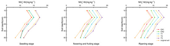 As depicted in Figure 4, throughout the tomato growth period, content in the soil at various depths showed a pattern of increase followed by a decrease, peaking at a depth of 10–20 cm. Compared to CK1, the content in the 10–20 cm layer decreased by 37.402–40.085% and 38.232–41.795% in T2 and T3, respectively, while it increased by 2.972–6.335% and 2.803–7.766% in CK2 and T1, respectively. These results suggest that biochar and biogas slurry enhance the accumulation of , whereas DCD significantly inhibits it.