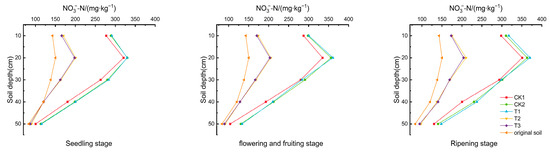 Three representative plants from each treatment were selected at every growth stage. Soil samples were extracted using a soil auger from five different depths, each 10 cm thick, located 10 cm from the plant stem base along the vertical ridge. Samples were air-dried, ground, and sieved to determine the pH and organic matter content, among other parameters. Organic matter was quantified using the potassium dichromate method; soil pH was measured with a DDSJ-308F detector; nitrate nitrogen and ammonium nitrogen levels were determined using a spectrophotometer.