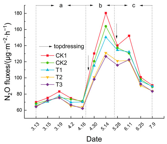 Variation curve of soil N2O emission flux (where a, b, and c in the figure represent the seedling stage, flowering and fruiting stage, and ripening stage, respectively).