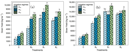Interactive effects of biochar and irrigation regime on grain yield (a) and straw yield (b) of wheat. Different letters above the bars indicate significant differences between treatments, as determined by two-way ANOVA followed by Tukey’s test. Error bars represent the standard error of the mean (SEM).