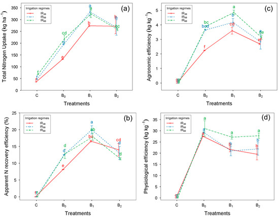 Interactive effects of biochar and irrigation regime on total nitrogen uptake (a), apparent N recovery efficiency (b), agronomic efficiency (c) and physiological efficiency (d). Different letters above the bars indicate significant differences between treatments, as determined by two-way ANOVA followed by Tukey’s test. Error bars represent the standard error of the mean (SEM).