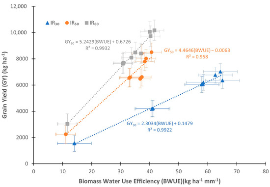 The relationship between grain yield (GY) and biomass water use efficiency (WUE) varied across all irrigation regimes, with all exhibiting strong positive linear correlations (R2 = 0.95) (Figure 4). IR60 showed the highest correlation (R2 = 0.9932), indicating a strong linear increase in GY with increasing WUE, following the equation GY60 = 5.2429 (WUE) + 0.6726. This suggests that for every 1 kg ha⁻1 mm⁻1 increase in WUE, GY increased by 5.2429 kg ha⁻1. Similarly, IR50 demonstrated a strong correlation (R2 = 0.958) with a slightly lower yield response, where a unit increase in WUE resulted in a 4.4646 kg ha⁻1 rise in GY, following the equation GY50 = 4.4646 (WUE) − 0.0063. IR30, while still maintaining a strong correlation (R2 = 0.9922), exhibited the lowest response, with GY30 = 2.3034 (WUE) + 0.1479, indicating a 2.3034 kg ha⁻1 increase in GY per unit rise in WUE. This also illustrates that higher levels of irrigation (IR60) lead to increased grain yield with per unit increment in water use efficiency. This is especially evident in the steeper slopes of the regression lines for the IR50 and IR60 irrigation regimes when compared to IR30. These results highlight that higher irrigation levels (IR60) led to the most substantial grain yield response per unit increase in WUE, while lower irrigation levels (IR30) resulted in comparatively weaker yield responses.