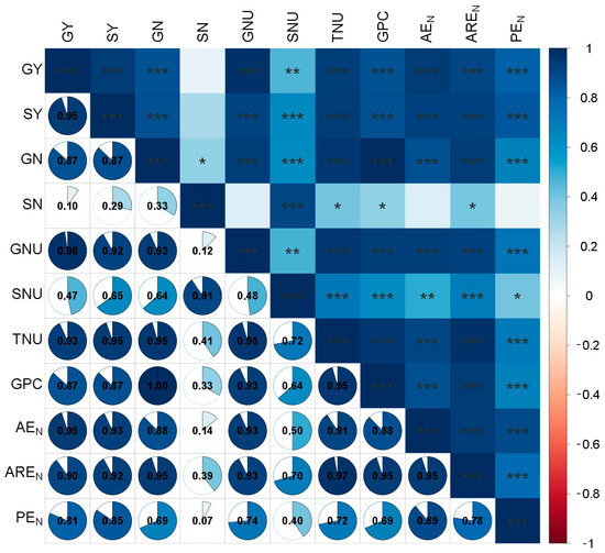 Correlation matrix applied for N-use efficiency of wheat grown with three levels of biochar and three levels of irrigation regime. Pearson correlation tests are given correlation coefficient values (below the diagonal) and the p-value (above the diagonal). Dark blue and light blue color show higher and lower values. Significant at * p ≤ 0.05, ** p ≤ 0.01, *** p ≤0.001; GY: grain yield; SY: straw yield; GN: grain nitrogen; SN: straw nitrogen; GNU: grain nitrogen uptake; SNU: straw nitrogen uptake; TNU: total nitrogen uptake; NHI: nitrogen harvesting index; GPC: grain protein content; AE: agronomic efficiency; ARE: apparent N recovery efficiency; PE: physiological efficiency.