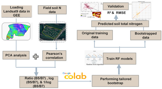 In this study, a customized bootstrap-based RF approach was integrated with remote sensing to improve total soil N prediction modeling, addressing national requirements for rapid monitoring responses. The objectives were to (i) develop and assess a remote sensing-based framework for predicting soil N in data-scarce regions, (ii) assess the impact of customized bootstrap-based RF modeling strategy, and (iii) emphasize the importance of remote sensing in enhancing soil fertility management.