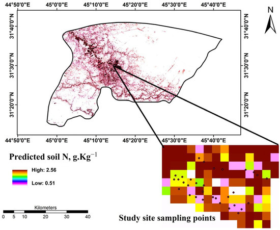 The distribution of total soil N contents based on the bootstrapped RF log (B5/B7) model in the Al-Rumaitha district and zoomed-in section of the study site.