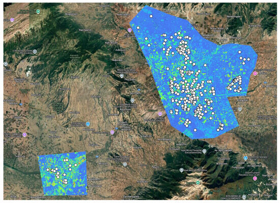 The study area is in the Drama Plain, northern Greece, where cotton is a major crop, cultivated on approximately 3573 hectares in 2023 [20]. The region exhibits a temperate Mediterranean climate, with cool and wet springs and hot, dry summers. Rainfall is scarce during summer, making irrigation a critical factor for sustaining crop productivity. However, growers typically apply sufficient irrigation to meet the crop’s water requirements. In total, 309 cotton field parcels were sampled for soil analysis, and cotton yield was reported by the growers. Moreover, an extensive survey was conducted to collect all the agronomic information associated with these parcels from the farmers (such as yields, fertilization types and rates, agrochemicals’ applications, etc.). Figure 1 shows the cotton field parcels where this study was conducted.