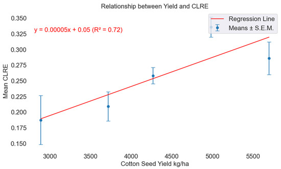 Obviously, the CLRE index correlates well with yield, as shown in Figure 2, because the images were taken close to the cotton harvest. However, the soil model, along with the farming practices, were adequate in explaining the yield variance, and, thus, the MAE did not increase significantly when the CLRE index was excluded from the model. This proves that the soil model aided in the prediction accuracy of the cotton RF yield model and, thus, it can safely be used for estimating the N rate of the cotton crop. The concept of using a yield model to predict the optimal N rate was described by Iatrou et al. [62], where yield curves were generated by supplying varying N rates to the algorithm. Ultimately, the minimum N rate that maximized yield was recommended to growers. A similar approach is applied here, where the optimal N rate for each field parcel is determined based on a constructed yield curve for various rates of N of each field parcel. The ideal fertilization dose is identified at the point where the maximum yield is achieved with the lowest N input.