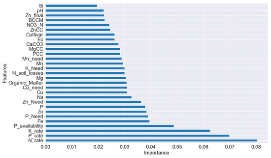 Variables related to P availability and cotton P need were high in the feature importance score. This is because P is a key nutrient for cotton growth and yield [35]. P has low mobility in the soil, and mobility to the roots is the prime limitation to uptake, particularly for alkaline soils rich in CaCO3, which characterizes most of the field parcels used in the current study. The limited availability of P in the soil significantly restricts cotton productivity, as P deficiency in cotton plants leads to slower shoot growth, delayed flower bud formation, dark green foliage, and necrosis of lower buds, often accompanied by yellowing of older leaves. P improves root development, water use efficiency, energy balance, the weight of fiber, and fiber quality [63]. Figure 4d, though, shows that yield decreases at P availability above 10 kg P/stremma. On the other hand, Figure 4b shows that yield increases up to a dose of 30 kg P/ha and then starts decreasing. This decrease is probably due to the indirect effect of excess P on zinc deficiency in the young plant meristems. Thus, the P rate in cotton fertilization must be considered along with P availability in the soil for obtaining the maximum yield.