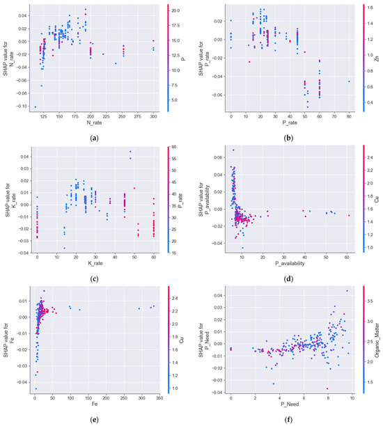 Figure 4e shows that yield increases with increasing Fe concentrations in soil, indicating that iron availability is crucial for cotton yield. However, at high Fe levels (>100 mg/kg), the influence on yield becomes neutral. Regarding the interaction with copper, the color gradient reveals that higher Cu concentrations (red points) tend to correspond with slightly more positive SHAP values at lower Fe levels.