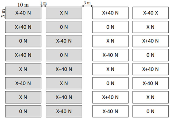 Scheme of the field experimental design. Gray boxes represent the area, which received activated carbon. X represent the preconized N dose.
