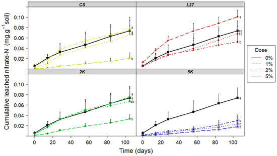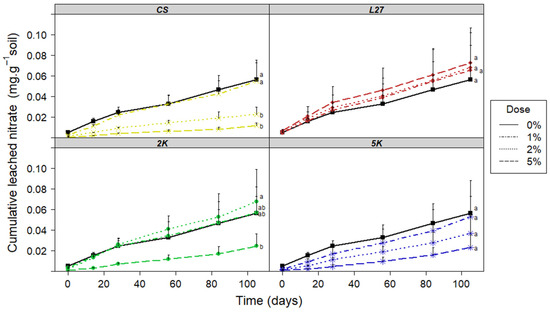 Cumulative leaching of nitrate-N (mg.g−1 soil) from the Tournoisis soil amended with different activated carbons at 0%, 1%, 2%, and 5% (w/w). CS = activated carbon obtained from organic material and physical activation; L27 = activated carbon obtained from organic material and chemical activation; 2K = activated carbon obtained from mineral material and physical activation; 5K = activated carbon obtained from mineral material and physical activation. Letters indicate a significant difference between the doses within an activated carbon (p < 0.05).