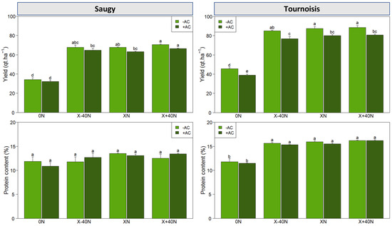 On Tournoisis, the yield on the non-amended and non-fertilized condition was higher than on Saugy, at 45.73 qt.ha−1 (Figure 4). In all cases, AC negatively affected yield across all treatments, while N application increased it by 82% on average.