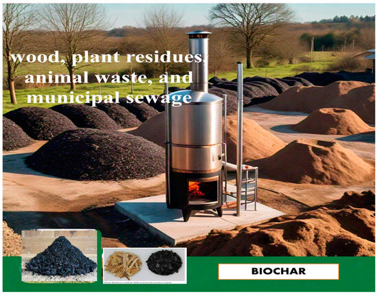 Biochar is an organic material made by pyrolysis of different biomass materials such as wood, plant residues, animal waste, and municipal sewage (Figure 1) at temperatures between 300 and 1000 °C in partial or anaerobic conditions [28]. It was defined as a porous, carbon-rich solid by Xiong et al. [29] due to organic compounds undergoing thermochemical transformation in an oxygen-deficient environment. It is a finely textured, carbon-dense material with a porous structure that is produced when organic biomass undergoes a low-temperature, oxygen-free thermochemical conversion process called pyrolysis [30]. When added to the soil, this stabilized biomass alters the soil environment, thereby enhancing the supply of soil ecosystem services, nutrient dynamics, and crop yields. Carbon is the dominant element in biochar, but also contains essential macronutrients like nitrogen, phosphorus, sulfur, ash, hydrogen, and oxygen, and micronutrients like potassium, calcium, sodium, and magnesium [30], necessary for plant growth and productivity. The composition of biochar changes depending on pyrolysis temperature, with an increase in temperatures (300–800 °C) resulting in higher carbon content and lower levels of nitrogen and hydrogen [24].