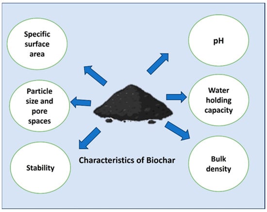 Key physicochemical characteristics of biochar include enhanced cation exchange capacity (CEC), low bulk density, increased surface area and porosity, neutral to elevated pH, and higher amounts of carbon. Additionally, it contains basic cations like Ca, K, and Mg as well as N, P, and other elements that are vital to plant growth and productivity [126,127]. The unique physical and chemical biochar characteristics resulting from feedstock material and production processes affect its efficacy in supplying soil ecosystem services [128]. These characteristics include bulk density, cation exchange capacity, particle size, pore structure and distribution, pH, surface area, and the quantity and diversity of diverse functional groups (Figure 2).