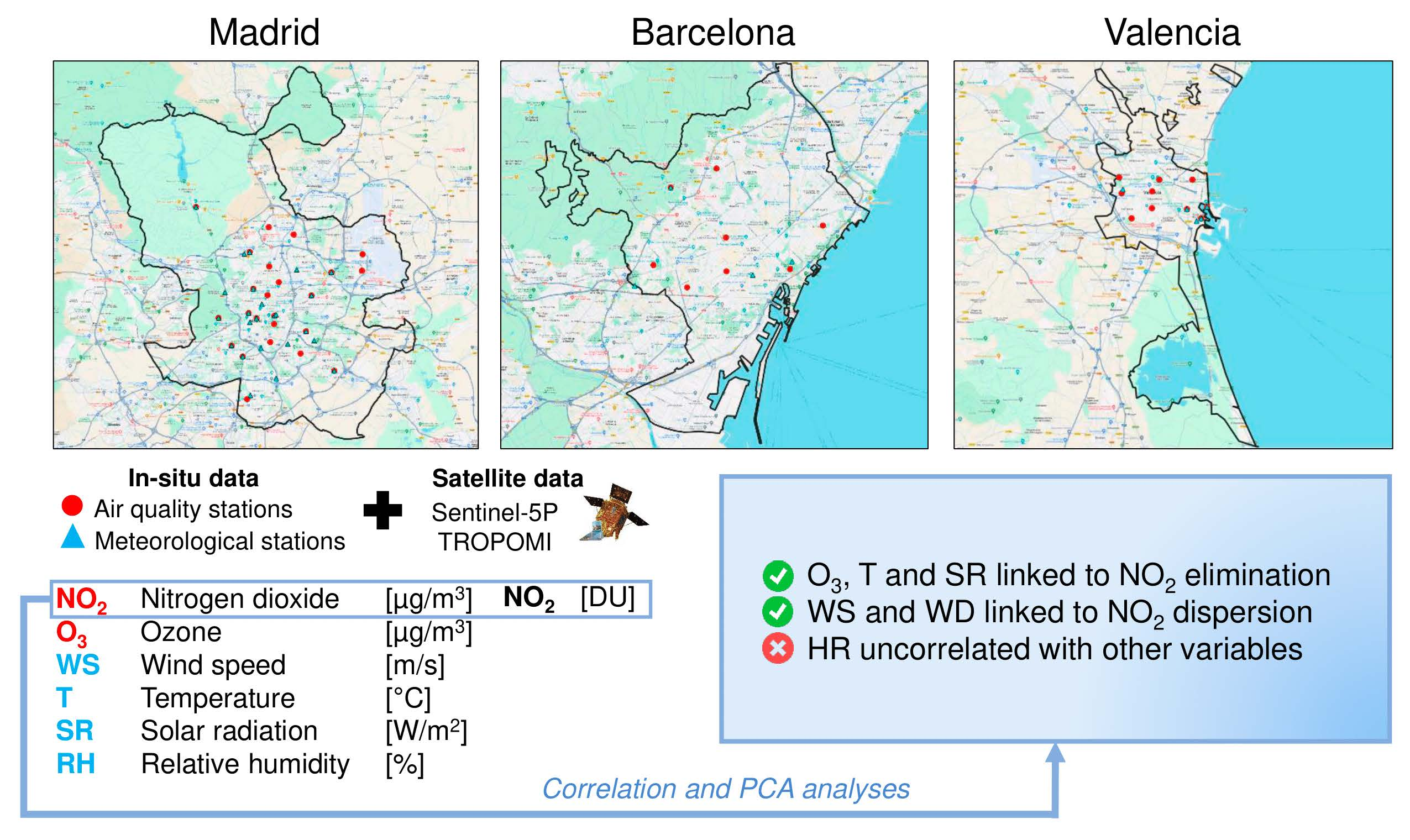 A correlation analysis showed that increased O3 pollution and wind speed were linked to lower NO2 concentrations in all three cities for both datasets. This is due to O3 and NO2 being involved in opposite formation processes, and wind speed promoting their dispersion. Temperature and solar radiation also presented an inverse relationship, as they trigger NO2 photolysis (and hence O3 formation). However, the results using in situ and satellite data were only comparable in Madrid. The distribution of NO2 concentration based on wind direction showed an overall good agreement, although air quality in Madrid was more dependent on wind speed. Relative humidity did not show significant correlations in any case. The PCAs identified and confirmed these connections, with slight differences across cities and datasets. NO2 was consistently associated with two clusters: one formed by O3 concentration, temperature and solar radiation, and the other by wind speed.