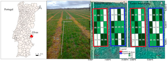 The methodology of this study had three main components. The first was the implementation of the crop response plot experiments as described in [24]. This implementation considered three main factors to be varied: crop (monoculture of annual ryegrass vs. grass–legume mixed fodder crop), irrigation (irrigated vs. rainfed) and three N levels to be tested (N0, N1, N2), applied as ammonium nitrate (27% N). In this way, several possible combinations were analysed.