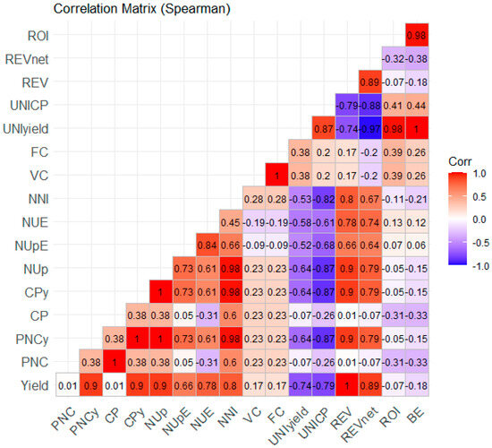 To quantify the degree and direction of associations between the variables, Spearman’s rank correlation coefficient (rs) was employed. This non-parametric method was chosen because it does not assume normality in the data and is robust for analysing monotonic non-linear relationships, common in biological and economic datasets, as well as being less sensitive to outliers. The correlation matrix allowed for the identification of interdependencies between the different productive and economic factors.