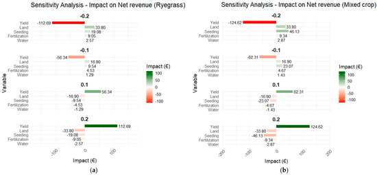 Sensitivity analysis was carried out to assess the impact of the different variables on the net profits of the two crops analysed. With the main objective of knowing the influence of changes in the main economic variables on REVnet (EUR ha−1), the factors that have the greatest impact on profitability in the different scenarios studied were analysed. Variations in REVnet (EUR ha−1) were analysed in response to different levels of change in the selected variables (−20%, −10%, 10%, and 20%). These variations were applied proportionally to the average values of the variables to simulate scenarios of reduction and increase in the factors analysed. These percentages were chosen as they represent standard and widely accepted ranges in agricultural economic analyses, reflecting typical, yet plausible, variability in market conditions and operational costs. This approach allowed us to evaluate the stability of our economic outcomes under different potential future scenarios.