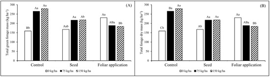 Total forage green mass (A) and total forage dry mass (B) were subjected to inoculation techniques (control, seed, and foliar) and nitrogen fertilization doses (0, 75, and 150 kg ha−1 of N). Capital letters indicate the effect of inoculation techniques within each dose of nitrogen fertilization. Lowercase letters indicate the effect of nitrogen doses in each form of inoculation by the Tukey test at 0.05.