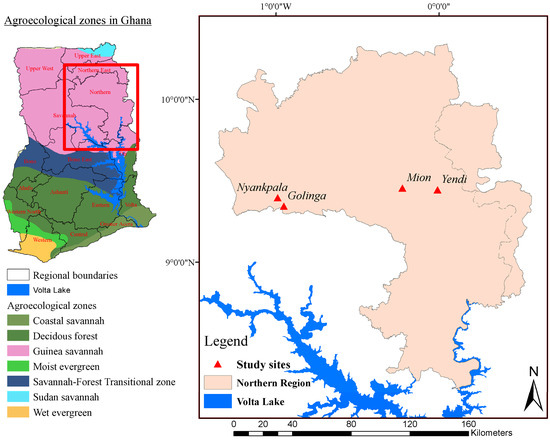 The study was conducted in four communities, namely Nyankpala, Golinga, Mion, and Yendi, in the Northern region of Ghana, which falls within the Guinea Savannah Agroecological zone (Figure 1). The vegetation is characterized by grassland with scattered trees and shrubs. It has a unimodal rainfall pattern with annual total rainfall amounts ranging between 1000 and 1300 mm with an annual average of 1100 mm [16]. The rainy season begins in May/June and ends in September/October, giving way to the dry season, which spans between 5 and 6 months. Average annual temperatures range between 27 °C and 36 °C [17]. The soils are generally coarse-textured and characterized by erosion, rendering the soil depth shallow in many locations (Table 1). They are also generally characterized by impervious Fe and Al concretions at depths between 30 and 50 cm, influencing their water-holding capacity.