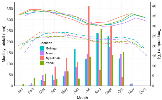 Observed rainfall (bars), and maximum and minimum temperatures (solid and dashed lines, respectively) for the locations in the experimental year (2016).