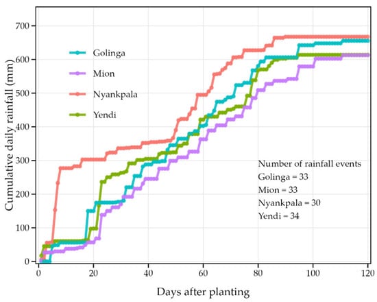 Weather data for the experimental period (Figure 1) showed Nyankpala receiving the highest total rainfall (1091.3 mm), with Yendi receiving the least (916 mm) for the 2016 cropping season. These rainfall amounts are within the range (900–1400 mm) typically observed for the region [4]. The average daily temperature across the four locations ranged from 28.1 to 29.1 °C, with Mion having the lowest and Nyankpala recording the highest daily temperature. All four locations experienced varying rainfall distributions (Figure 2) and an initial dry spell (Figure 3) over the growing season.