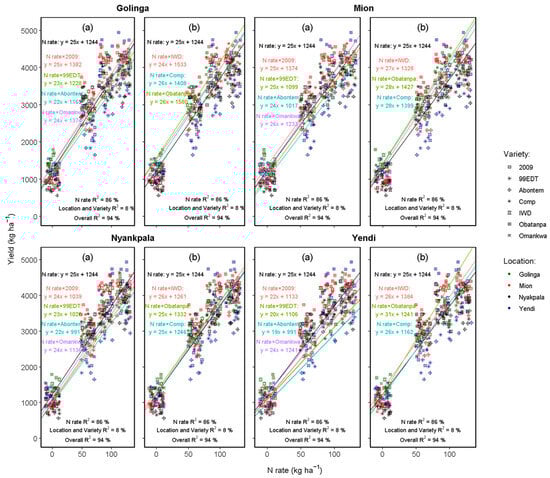 Generally, the yields obtained from the longer-maturity class varieties (IWD, Comp, and Obatanpa) were higher compared to those obtained for shorter-maturity varieties. The yield gains in response to N fertilization also varied across varieties and locations. For instance, whereas yield gains averaged across varieties were 254, 302 and 336% with the application of 60, 90 and 120 kg ha−1 N fertilizers, respectively, at the Nyankpala location, the respective yield gains at Golinga were 109, 175 and 196% for the same N application rates. There was a strong linear relationship (within the range of N applied) between N rate and grain yield. The coefficient of determination (R2) suggested that nitrogen alone accounted for 86% variation in grain yield, and the interaction between N, variety and location accounted for 7% of the variation in grain yield (Table A1). Hence, N and its interaction with variety and location accounted for 93% of all the variation in grain yield.