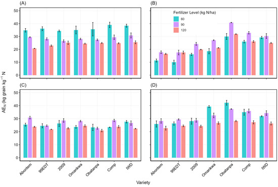 Additionally, whereas AEN was highest under 60 kg N ha−1 among most of the varieties at Nyankpala, the efficiency of the applied nitrogen was most efficient at the 90 kg N ha−1 rate at the remaining three locations. Except for the longer maturity varieties (Obatanpa, Comp, and IWD), the AEN was lowest at Yendi compared to the other three locations, whereas the AEN of the shorter maturity varieties was highest at Nyankpala.