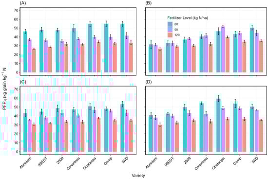 To evaluate the efficiency of the seven varieties in utilizing the inorganic fertilizer applied, the agronomic efficiency of nitrogen (AEN) and partial factor productivity of nitrogen (PFPN) were used as indicators. The AEN was generally higher at 60 kg N ha−1 for all the varieties in Nyankpala, while in Yendi and Golinga, it was typically higher at 90 kg N ha−1, with inconsistent trends observed in Mion. It ranged from a minimum of 10.1 kg grains kg−1 N applied with the 99EDVT variety fertilized at 60 kg N ha−1 to 40.8 kg grain kg−1 N applied, which was obtained with the Obatanpa variety fertilized at 90 kg N ha−1, both at Yendi (Figure 5). The agronomic efficiency of nitrogen use of the varieties was significantly influenced by location, variety, nitrogen rate, and the interactions among these factors (Table A2). For instance, whereas the AEN of Obatanpa at Mion at 60 kg N ha−1 was about 45 and 29% higher than what was obtained at Golinga and Yendi, respectively, it was about 18% lower than what was obtained at Nyankpala at the same nitrogen fertilization rate.