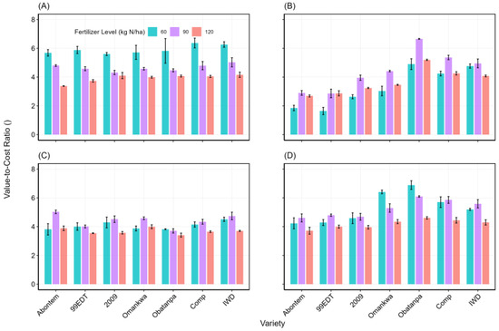 Value to cost ratio of using different rates of nitrogen fertilizer for different varieties and at different locations in the northern region of Ghana. (A–D) are Nyankpala, Yendi, Golinga and Mion, respectively.
