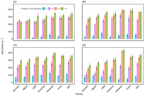 As with grain yield, the gross revenue (GR) was also significantly influenced by the interaction among location × variety × N rate. The variation in GR among the locations was not significantly (p = 0.05) different. Generally, increasing the N rate resulted in increased GR. The magnitude of yield gains due to fertilizer application varied significantly among the varieties, with the intermediate varieties obtaining higher gains compared to the extra short-maturity varieties. For instance, the GR increase of between 244 and 310% was obtained among the varieties over their respective control grain yields for the 2009EDVT and Obatanpa varieties, respectively, when 60 kg N ha−1 was applied. Applying fertilizer at 90 kg N ha−1 generally resulted in higher GR compared to the control and 60 kg N ha−1 but was similar to 120 kg N ha−1, suggesting 90 kg N ha−1 to be the economically optimum rate of N fertilization for the four locations (Figure 9). Nitrogen alone accounted for 79% of the variation in GR, and the interaction between N, variety, and location accounted for an additional 11% of the variation (Table A6). Hence, N and its interaction with variety and location accounted for 90% of all the variations in GR.